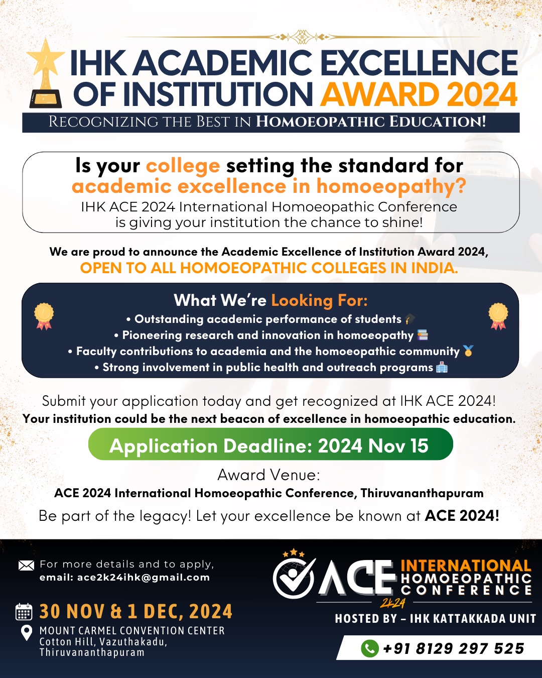 The institution of Homoeopaths Kerala is the India’s largest voluntary professional organization of Homoeopaths, comprising all categories of qualified Homoeopathic practitioners. Homoeopathy is at its best in Kerala when compared to all other states in India. We also feel honored in that the IHK has been undoubtedly credited with contributing much to the development of Homoeopathy in our state.
