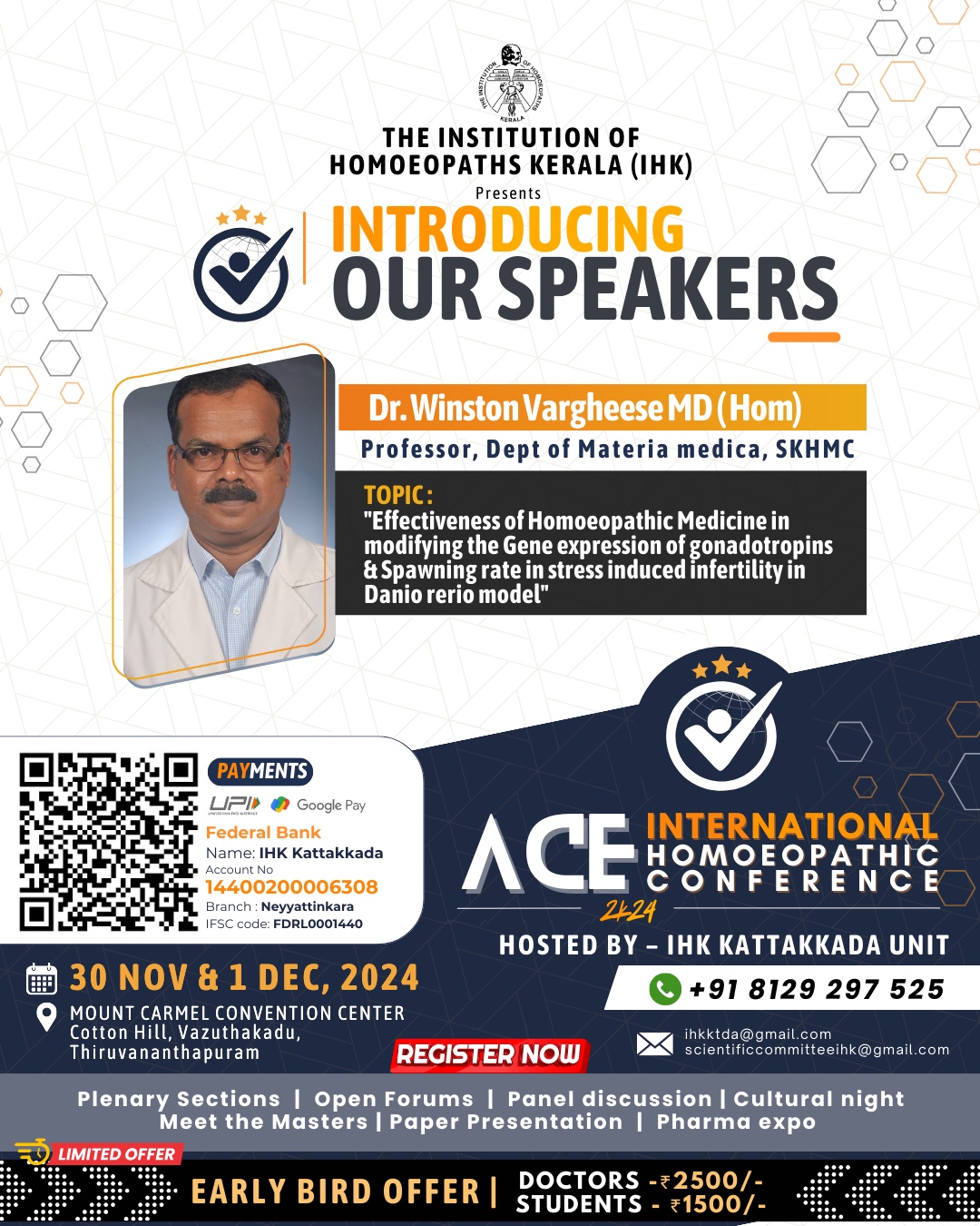 Dr Winston Vargheese MD(Hom) - Topic - Effectiveness of Homoeopathic Medicine in modifying the Gene expression of gonadotropins & Spawning rate in stress induced infertility in Danio rerio model
